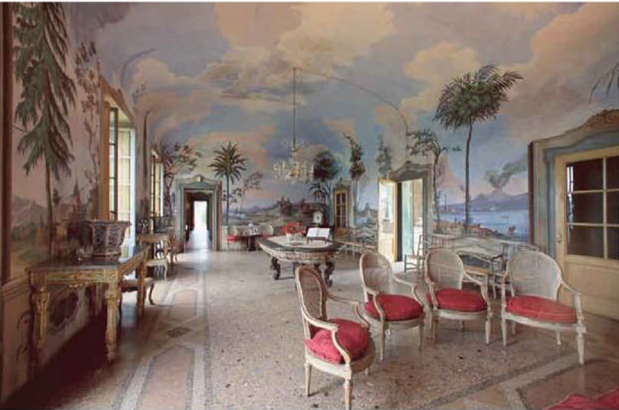 La seconda parte della visita si svolge nella Villa, sorta sull’antico borgo che era collegato alla Rocca e al cui interno vi erano laboratori di falegnami artigiani e fabbri. La fisionomia della Villa, si presenta oggi esattamente come appariva dopo la ristrutturazione della fine del 1700, che tramutò il “l’antico borgo in residenza estiva della Famiglia. Il cancello di gusto francese, come voleva la moda di allora introduce gli ospiti in un cortile, con pianta scenografica ad U e porticato su tra lati.